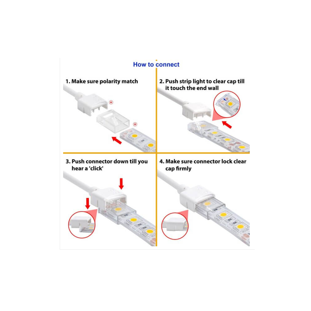 Dette vandtætte startstik er designet til at give en sikker og holdbar forbindelse til enkeltfarvede LED strips med en bredde på 8 mm. Med en IP68-klassificering er stikket fuldstændig beskyttet mod indtrængning af støv og vand, hvilket gør det ideelt til brug i krævende miljøer, hvor fugt og væske kan være en udfordring.
