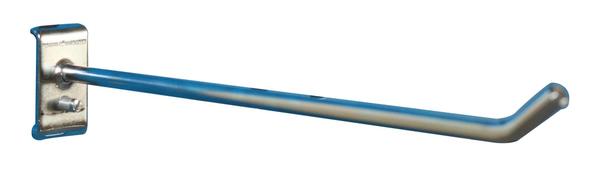 Varekrog med længde 350 mm og krogdiameter Ø4 mm. Designet med enkelt bagplade, passer til hulplader med firkantede huller (9 x 9 mm) og center afstande på 34 mm og 38 mm.