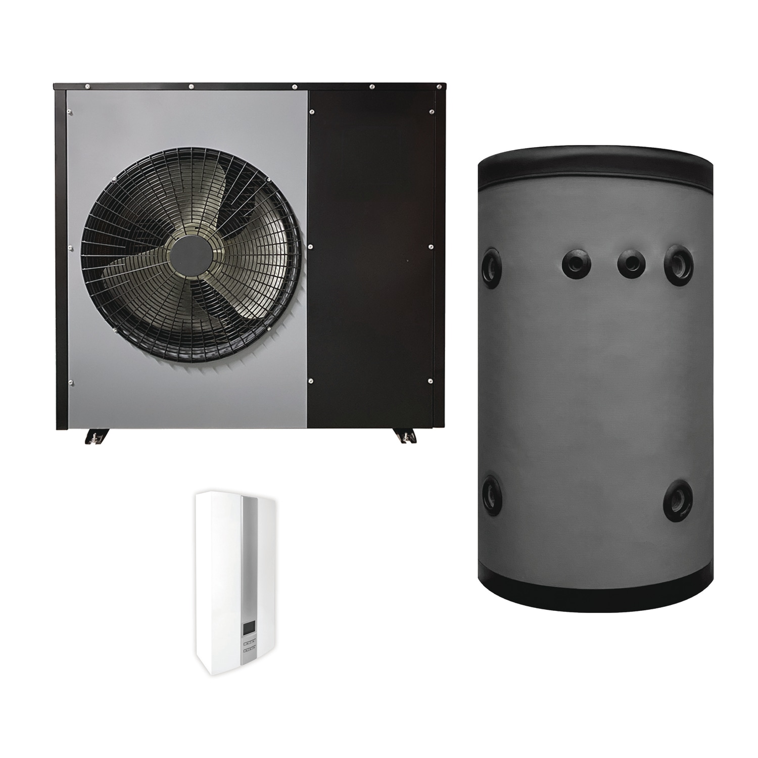 Komplet varmepumpekit med 12 kW nominel effekt, 160L buffer og 11 kW el-vandvarmer. Luft/vand model med A+++ energiklasse og app-styring.