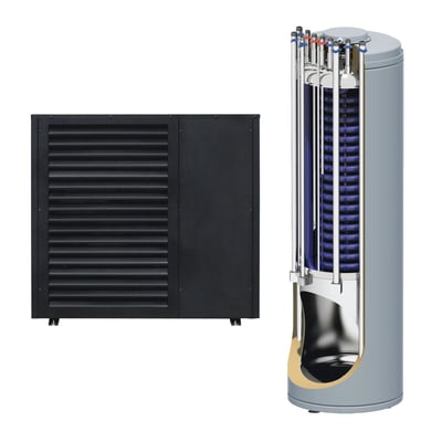 Effektiv luft/vand varmepumpekit med 8 kW nominel effekt og combi tank på 180/85 L. Energiklasse A+++.
