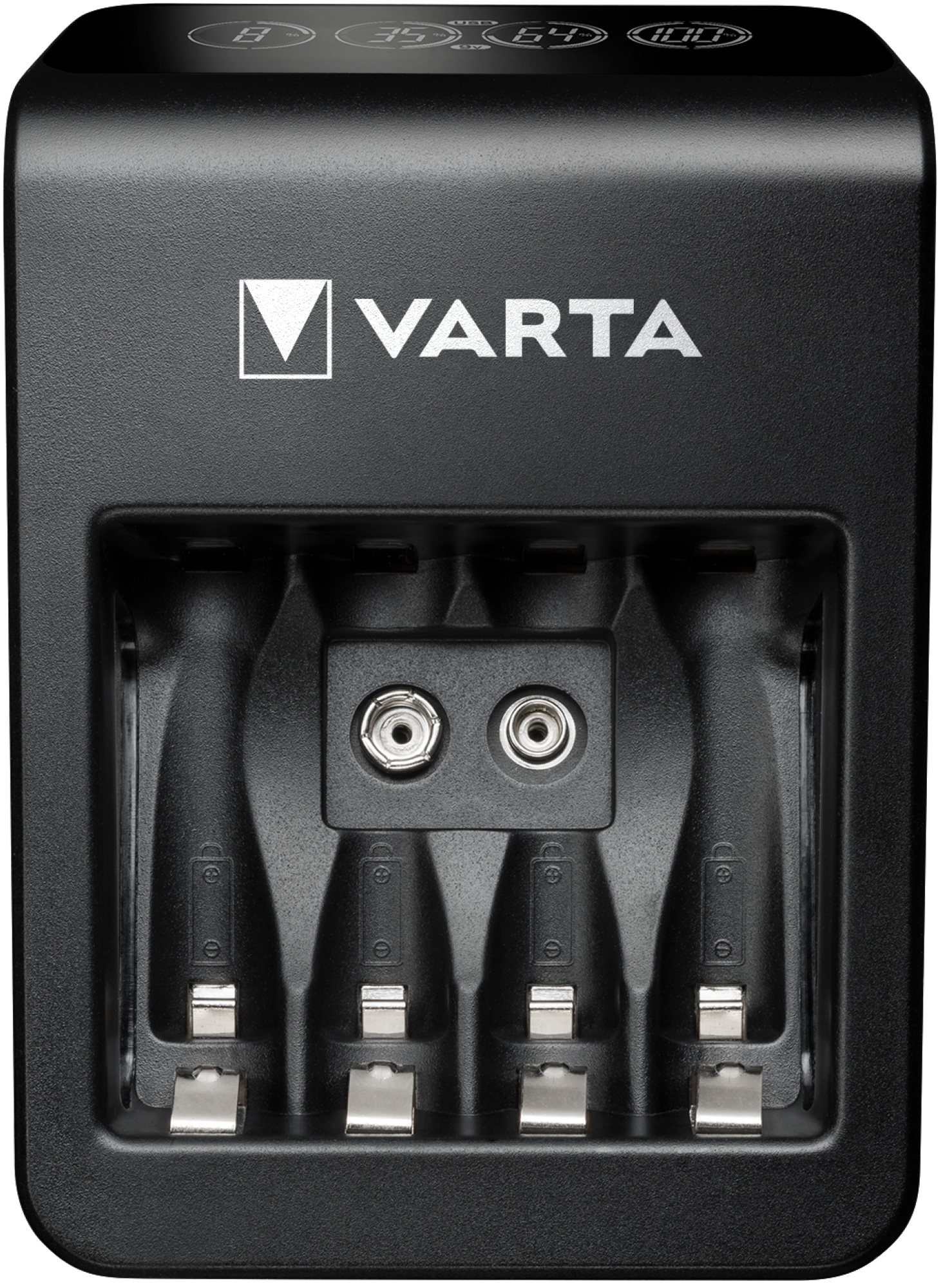 VARTA LCD Plug Charger+ oplader AA, AAA, 9V og USB-enheder. Med LCD-skærm, forbedret følsomhed ved dårlige celler og sikkerhedsfunktioner.