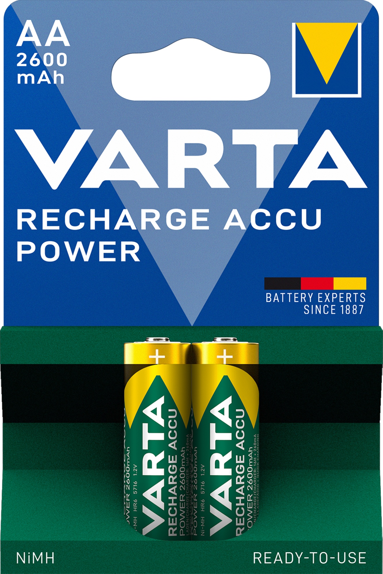 VARTA Recharge Accu Power AA batterier. Genopladelige Ni-MH accus med 2600mAh og Ready to Use teknologi. Leveres i pakke med 2 stk.