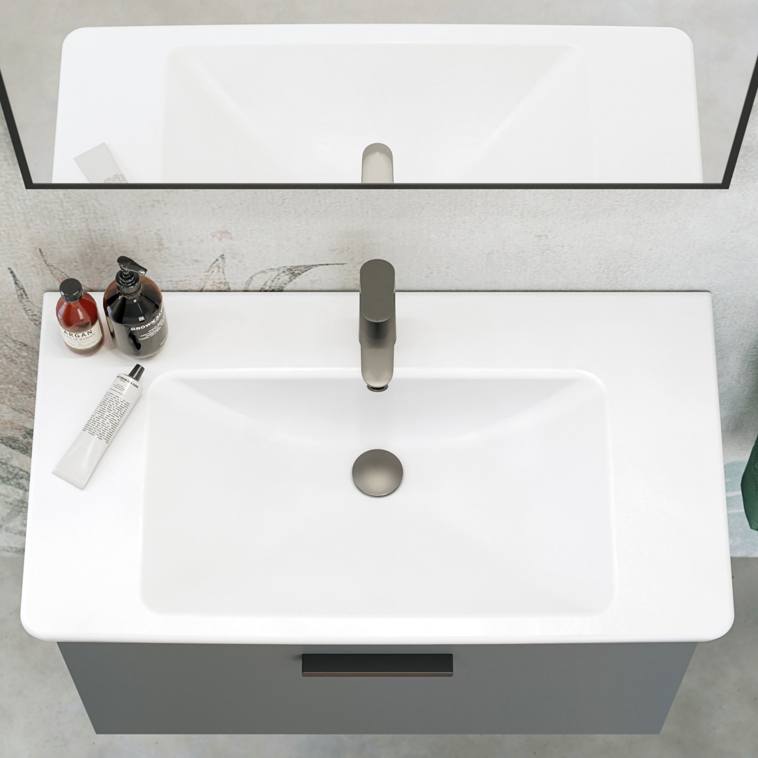 Vasken er designet til møbelmontering og har både hanehul og overløb, hvilket gør den praktisk og funktionel i daglig brug.
