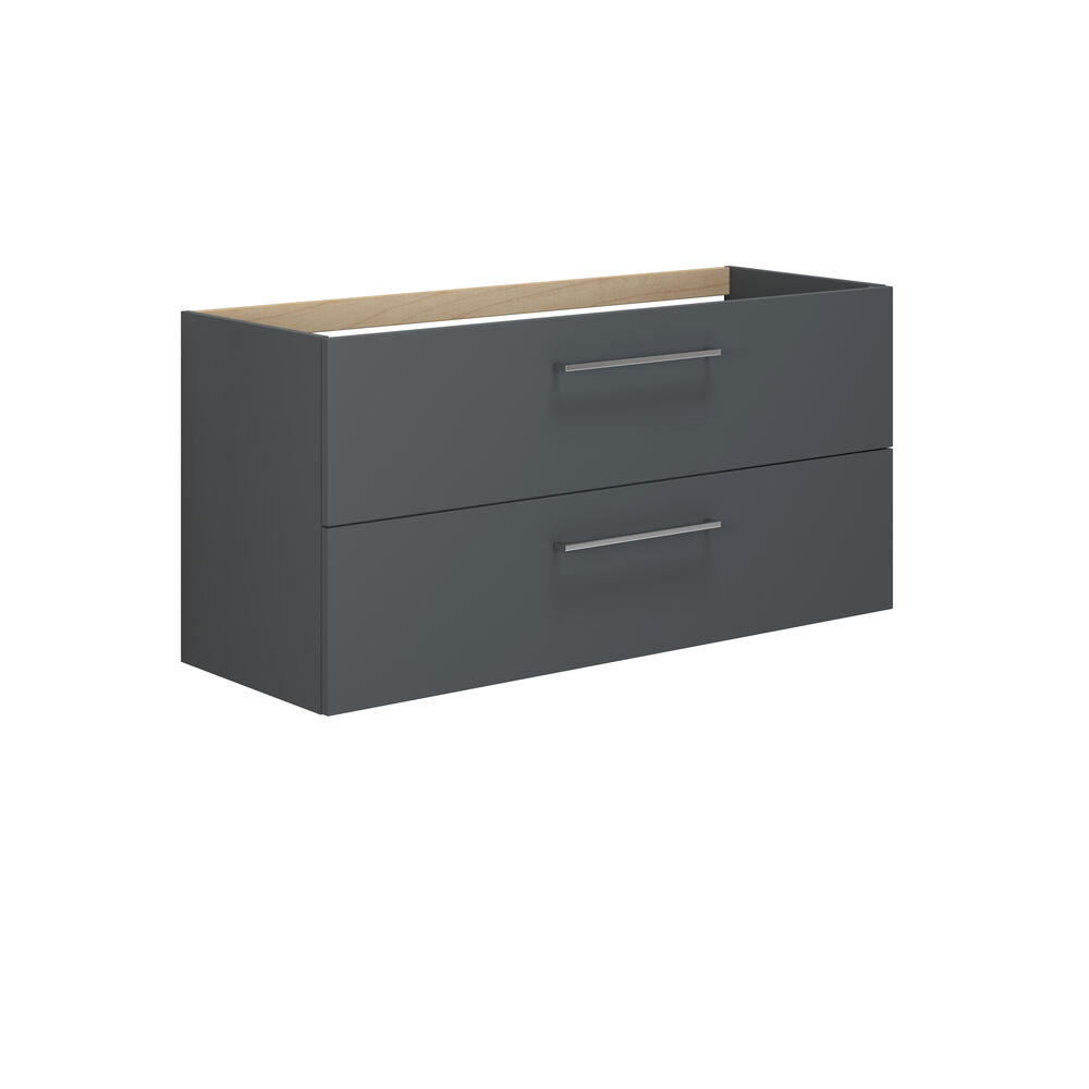 Elegant grå mat vaskeskab med 2 soft close skuffer, greb og 120 cm bredde. Moderne design til badeværelset.
