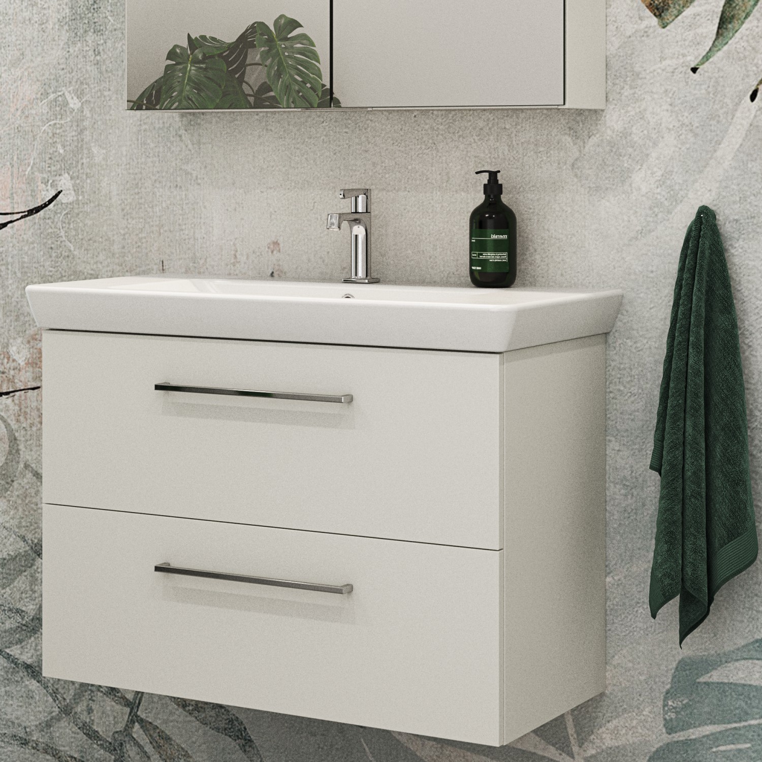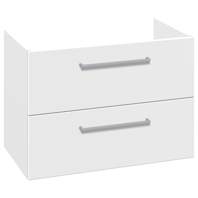 Elegant vaskeskab i hvid mat finish med to skuffer og soft close, der giver praktisk opbevaring på badeværelset.