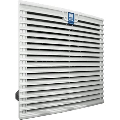 Effektiv tavleventilator på 20 m³/h til væg- og gulvskabe, 230V, med en kapslingsklasse på IP54 og mål på 116,5 x 116,5 x 43 mm.