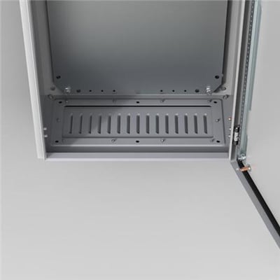 Ventileret flange med lamelbeskyttede ventilationsslidser. Fremstillet i 1,4 mm lakeret stål med RAL 7035 struktur pulvermaling.