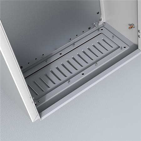 Ventileret flange med lamelbeskyttede ventilationsslidser, udpresset 5 mm. Fremstillet i 1,4 mm lakeret stål og pulverlakeret i RAL 7035. IP23 beskyttelse.