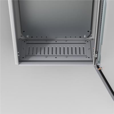Ventileret flange med lamelbeskyttede ventilationsslidser, udpresset 5 mm. Fremstillet i 1.4 mm lakeret stål med RAL 7035 struktur pulvermaling.