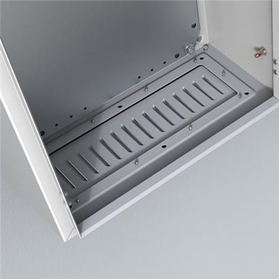 Ventileret flange med lamelbeskyttede ventilationsslidser, udpresset 5 mm. Fremstillet i 1,4 mm lakeret stål.