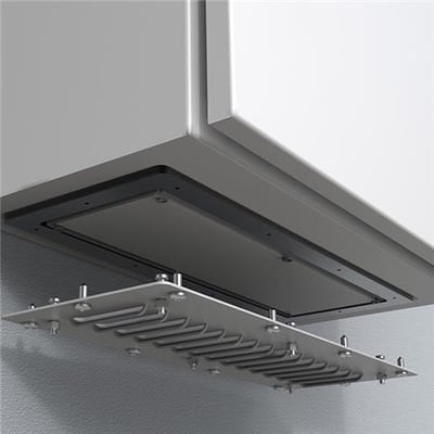 Ventileret flange med lamelbeskyttede ventilationsslidser, udpresset 5 mm. Materiale: 1,4 mm lakeret stål. RAL 7035 pulverlakering. IP 53 beskyttelse.