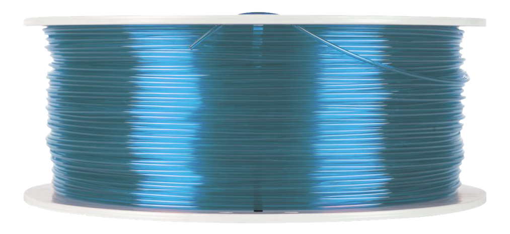 3D printer filament i PET-G, 1.75 mm, 1 kg. Blå transparent farve for holdbare prints.