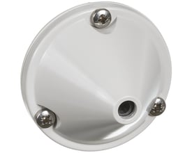 224. Duka One afstandsstykke i hvid plast til 160mm ventilationsrør, viser den runde udskæring og fire monteringshuller.Afstandsstykke til Duka One Ø160mm, 29 mm
