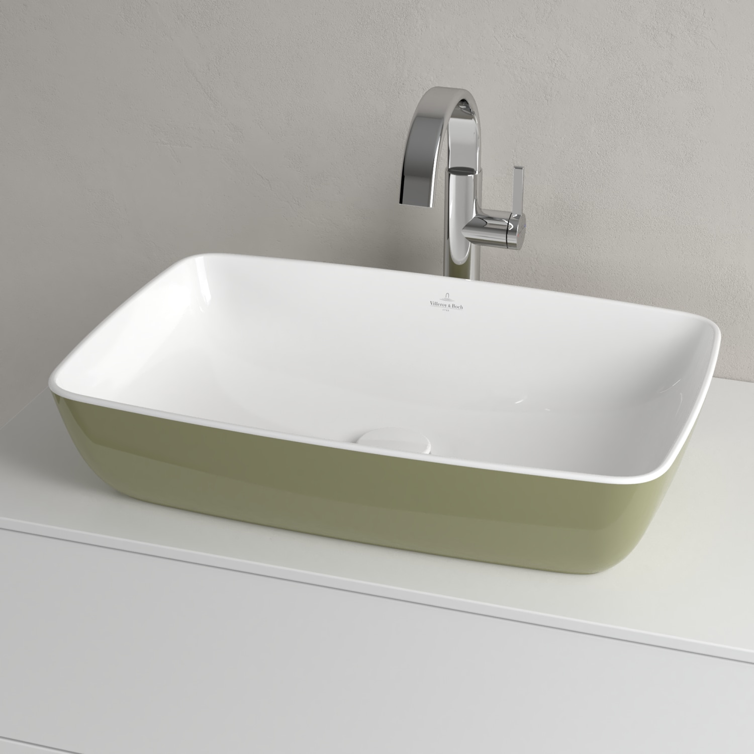 Elegant firkantet bordstående vask fra Villeroy & Boch i porcelæn/keramik med grøn farve og traditionel overflade.