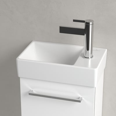 Denne firkantede Avento håndvask fra Villeroy & Boch er designet til møbelmontering og tilføjer et stilrent touch til ethvert badeværelse.