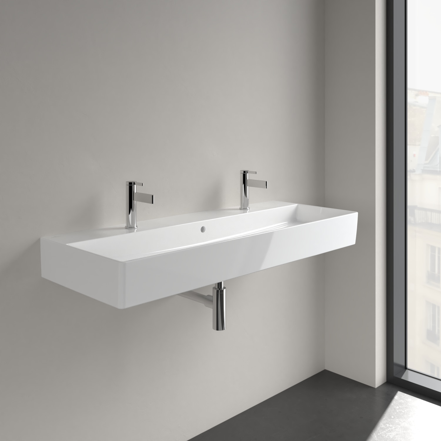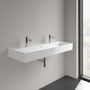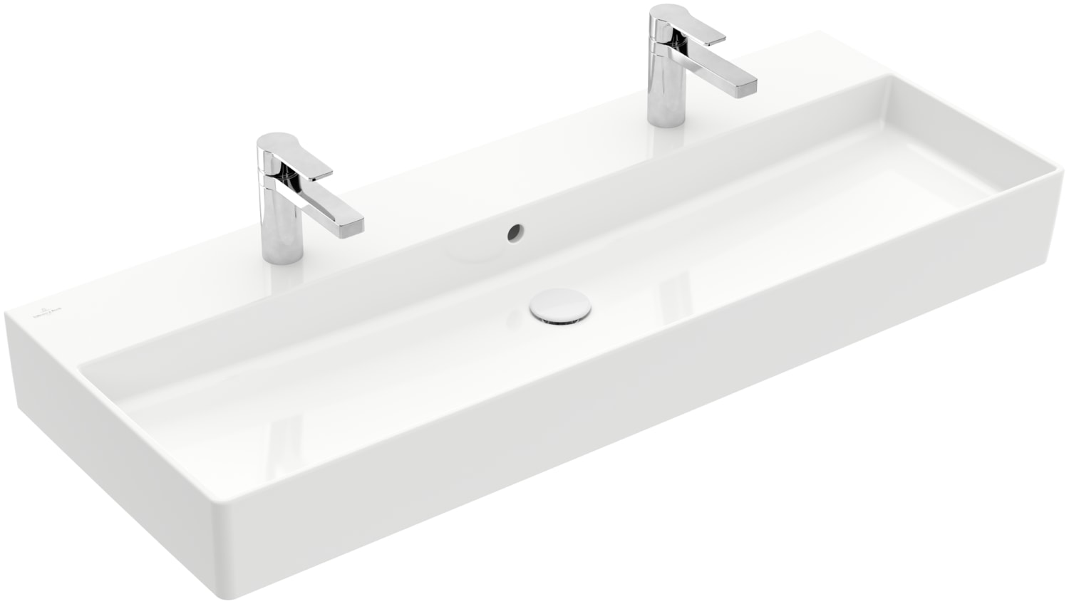 Elegant firkantet møbelvask i rengøringsvenlig porcelæn fra Villeroy & Boch. Mål: 120x47x15 cm. Med overløb og hanehul.