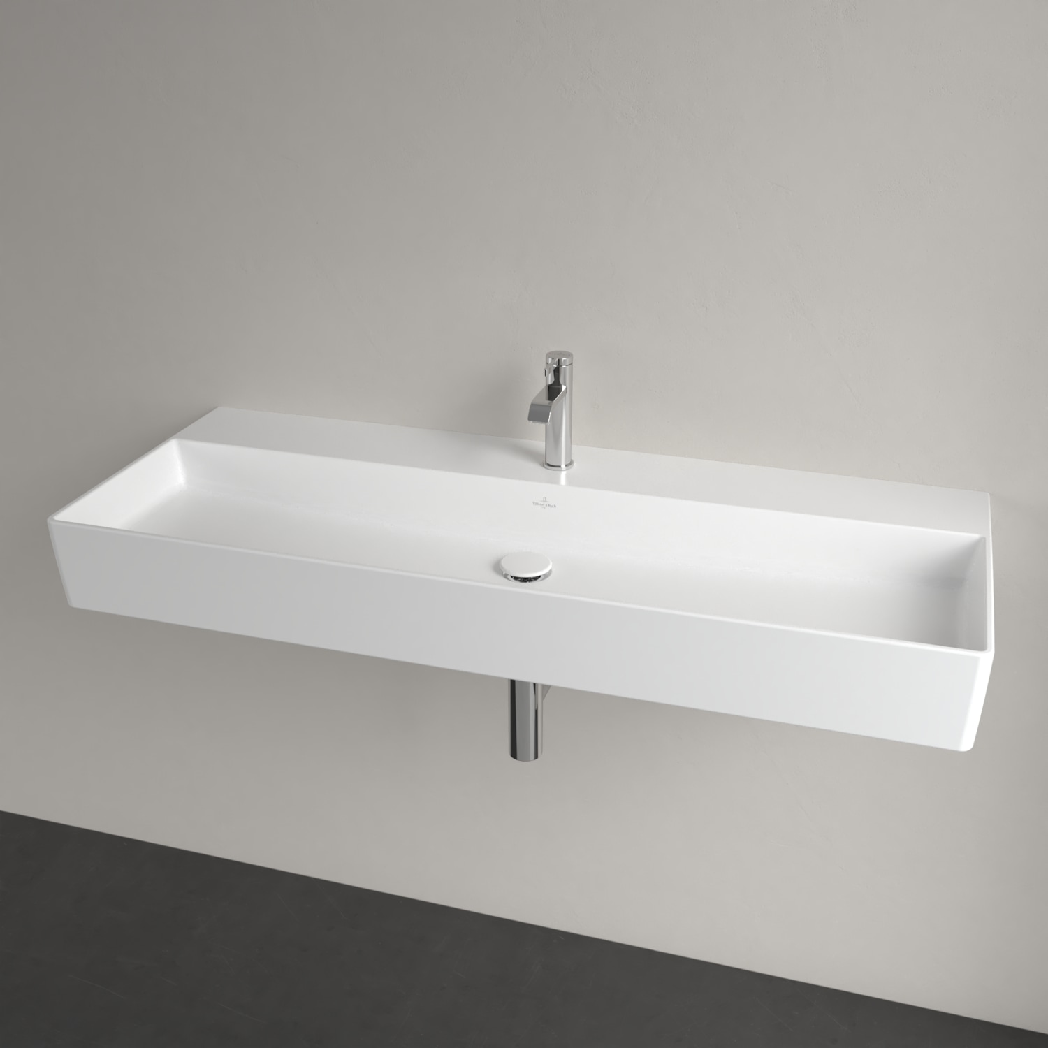 Elegant 120cm firkantet møbelvask i hvid porcelæn fra Villeroy & Boch. Med hanehul og uden overløb.