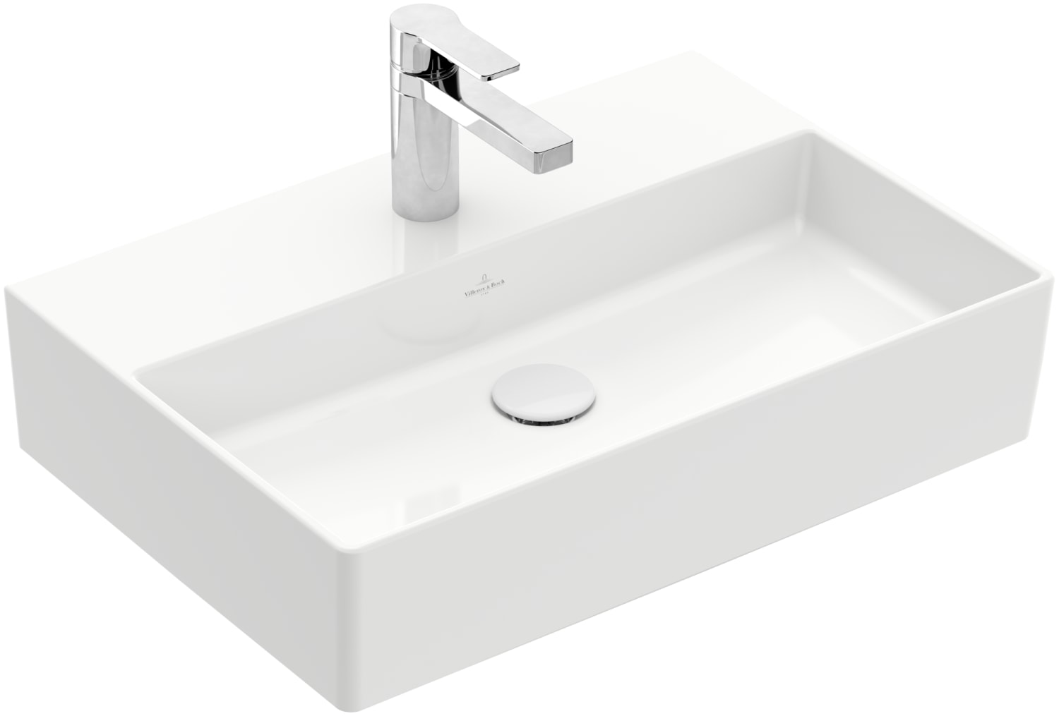 Firkantet møbelvask i porcelæn fra Villeroy & Boch Memento 2.0 serien. Måler 60x42 cm og har hanehul.
