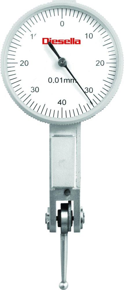 Diesella vippeindikator med hvidt standard måleur, 3 svalesporet opspænding og 16 mm vippearm. Aflæsning: 0,01 mm. Måleområde: 0 - 0,8 mm. Leveres i plastikkasse.
