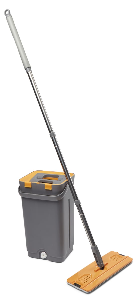 Komplet fladmoppesæt i kompakt pakke. Sættet har en unik størrelse, der ikke fylder meget og passer lige i skabet. Sættet indeholder spand, moppe med 150 cm skaft og 2 moppeklude.