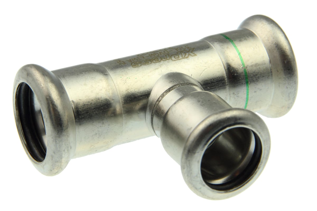 VSH XPress rustfri press t-stykke i stål til brugsvand, regnvand, varme- og køleanlæg. Passer til de fleste mærker af M-profil presværktøjer.