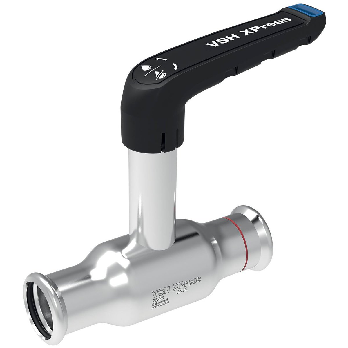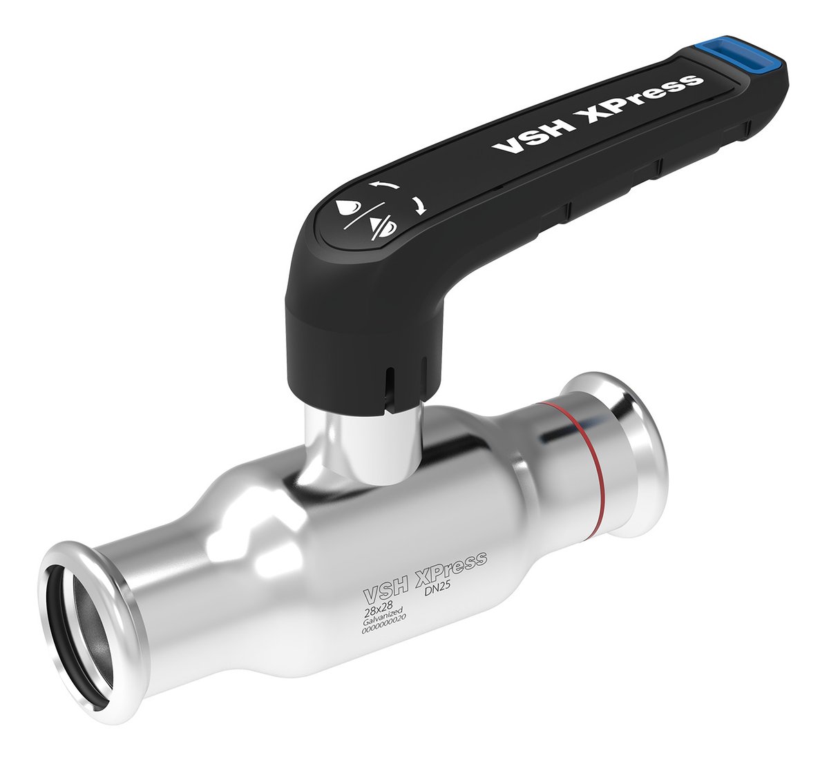 Vsh Xpress forzinket kugleventil til press-systemer til varme og køl. Maks. 16 bar og driftstemperatur fra -35 °C til +135 °C.