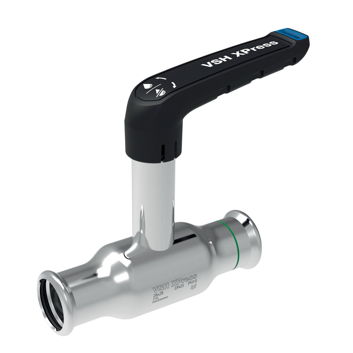 Vsh Xpress kuglehane i rustfrit stål til brugsvandsinstallationer og andre formål. Med 35 mm diameter, høj spindel og håndtag.