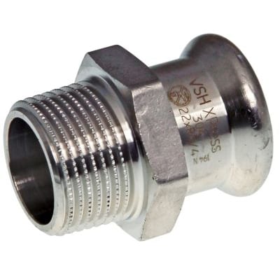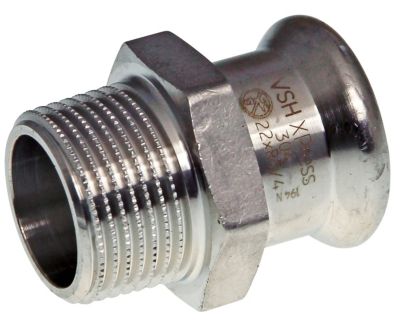 VSH XPress RF 304 R2405 er en lige overgang i rustfrit stål med press og gevindnippel, der sikrer en hurtig og nem installation i rørsystemer.