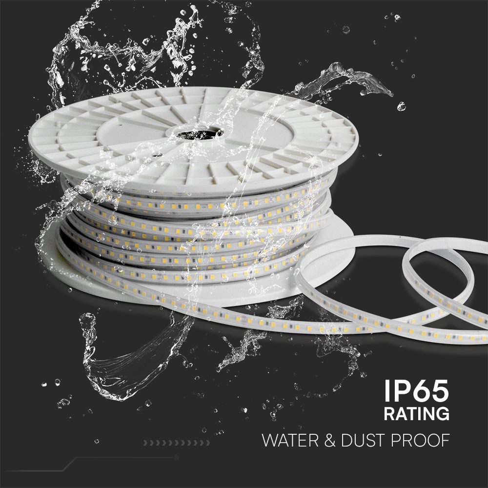 Med sin IP65-klassifikation er dette LED-lysbånd modstandsdygtigt over for støv og vandstråler, hvilket gør det velegnet til installationer både indendørs og udendørs. Lysbåndet leveres på en 50 meter rulle og er designet til direkte tilslutning til 220 V strømforsyning, hvilket forenkler installationen.