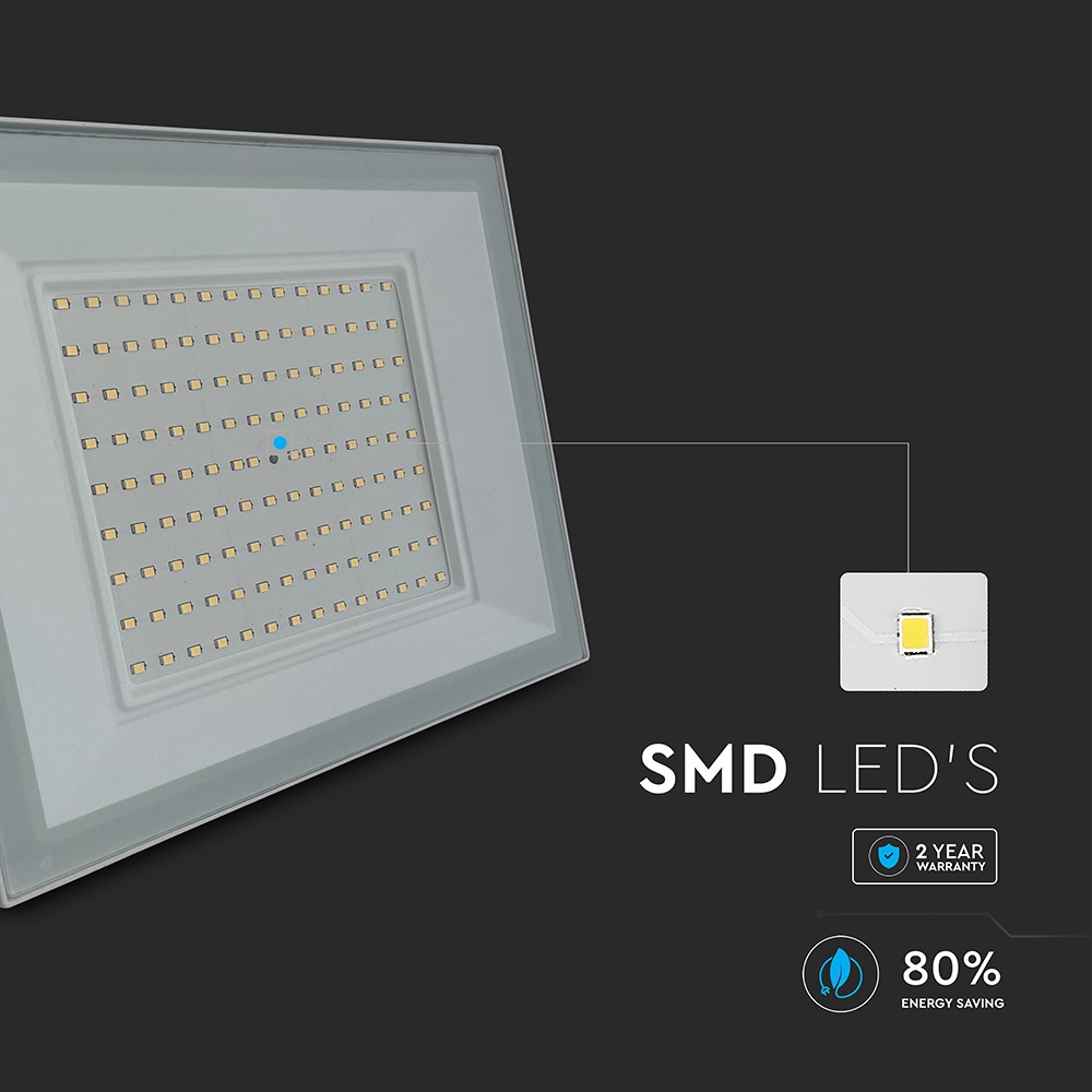 Denne 100W LED projektør fra V-TAC leverer en imponerende lysstyrke på 9500 lumen med en neutral hvid farvetemperatur på 4000K. Projektøren er designet til at være holdbar og modstandsdygtig over for elementerne, hvilket bekræftes af dens IP65 klassifikation. Det hvide hus er fremstillet af robust aluminium, der sikrer lang levetid.