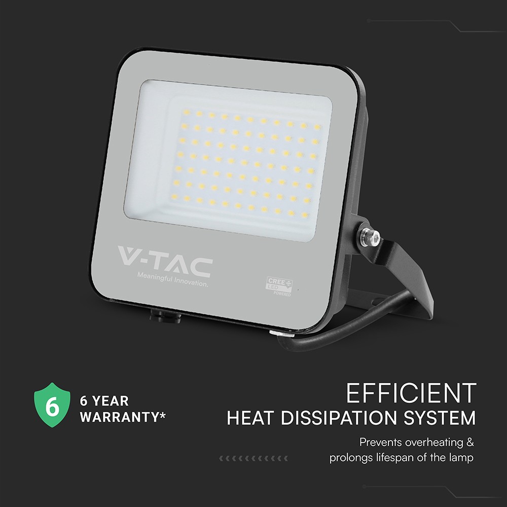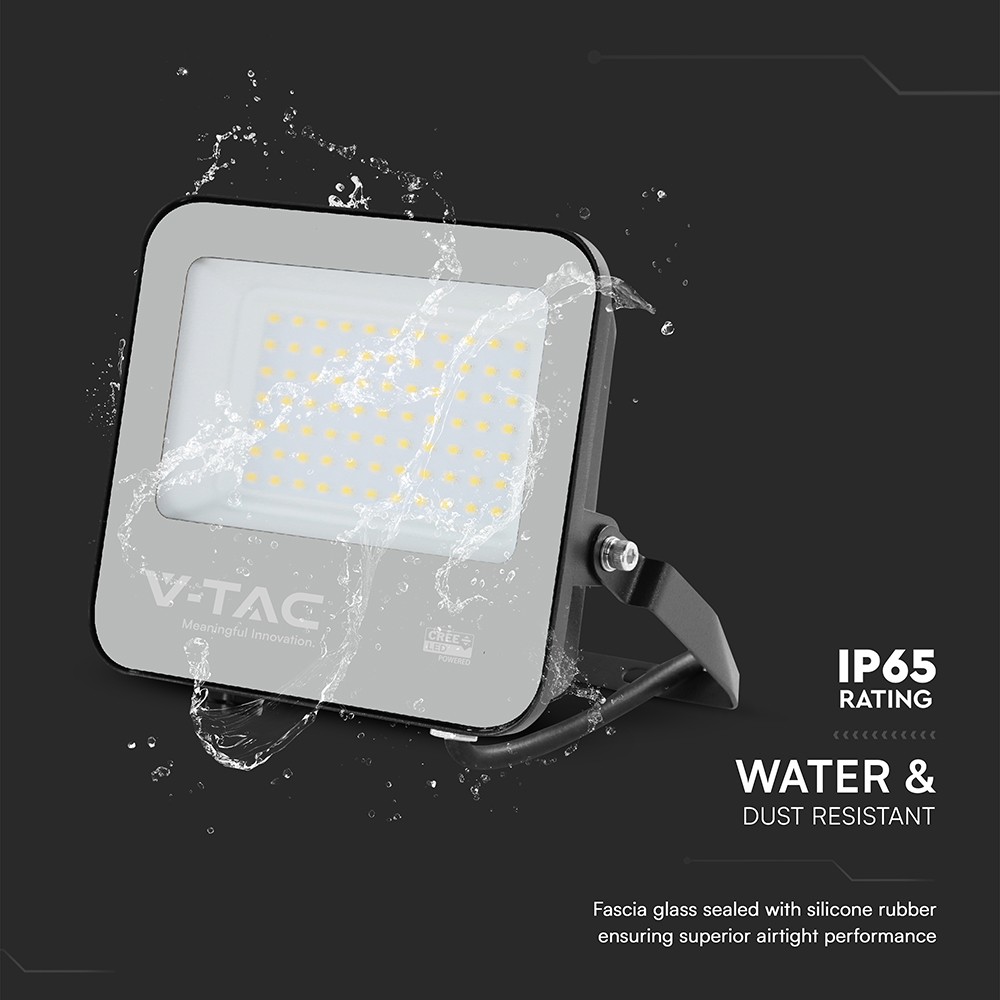 Kraftig 50W LED projektør med 6750 lumen. IP65-klassificeret og egnet til udendørs brug. Leverer neutralt lys med en levetid på 30.000 timer.