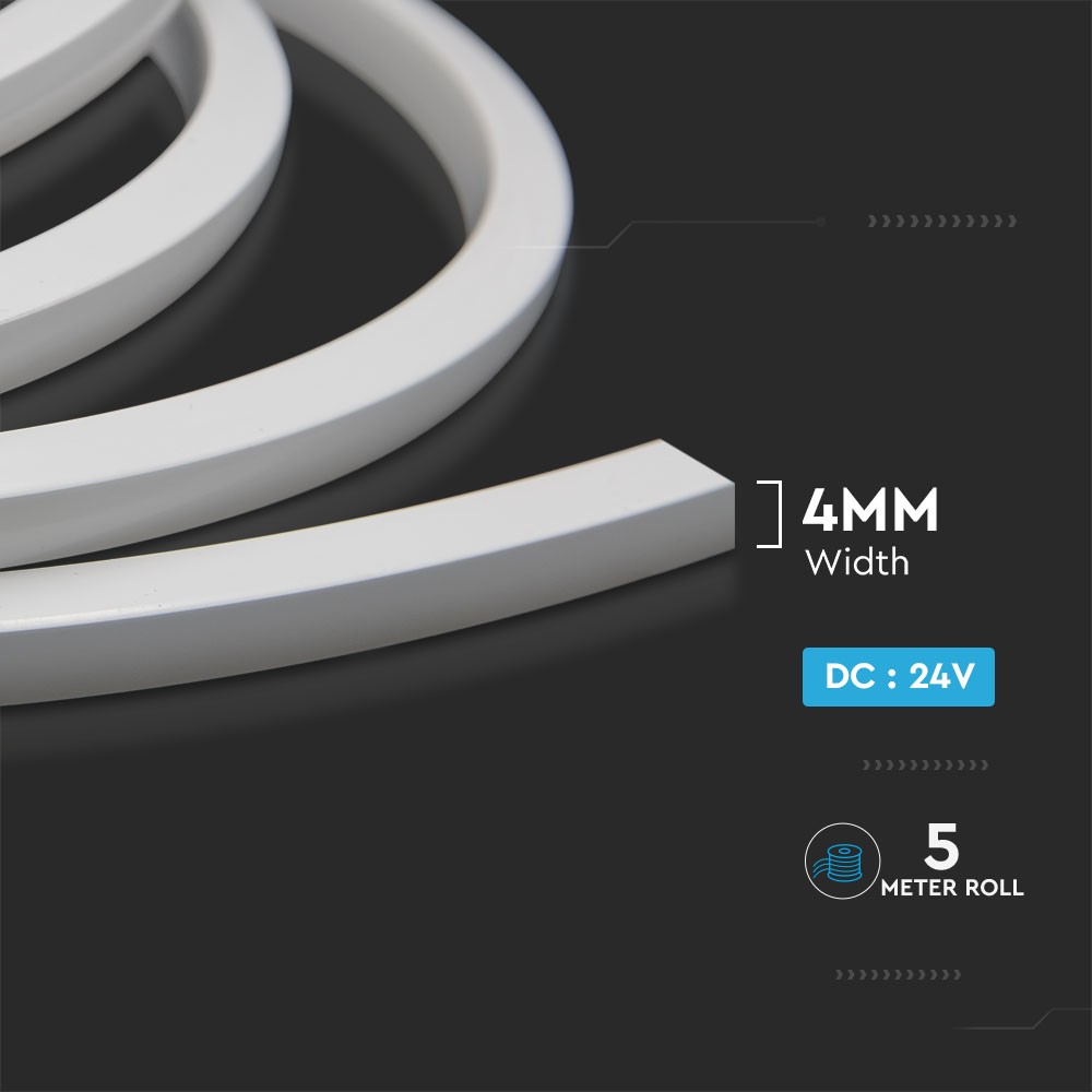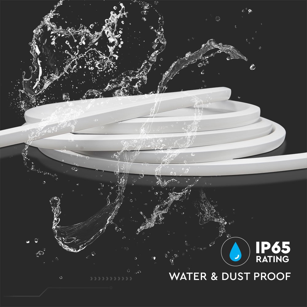 Denne VT-560 Neon Flex LED-strip er designet til fleksibel og holdbar belysning. Med et silikoneovertræk er strippen beskyttet mod fugt og støv, hvilket gør den ideel til en bred vifte af applikationer.