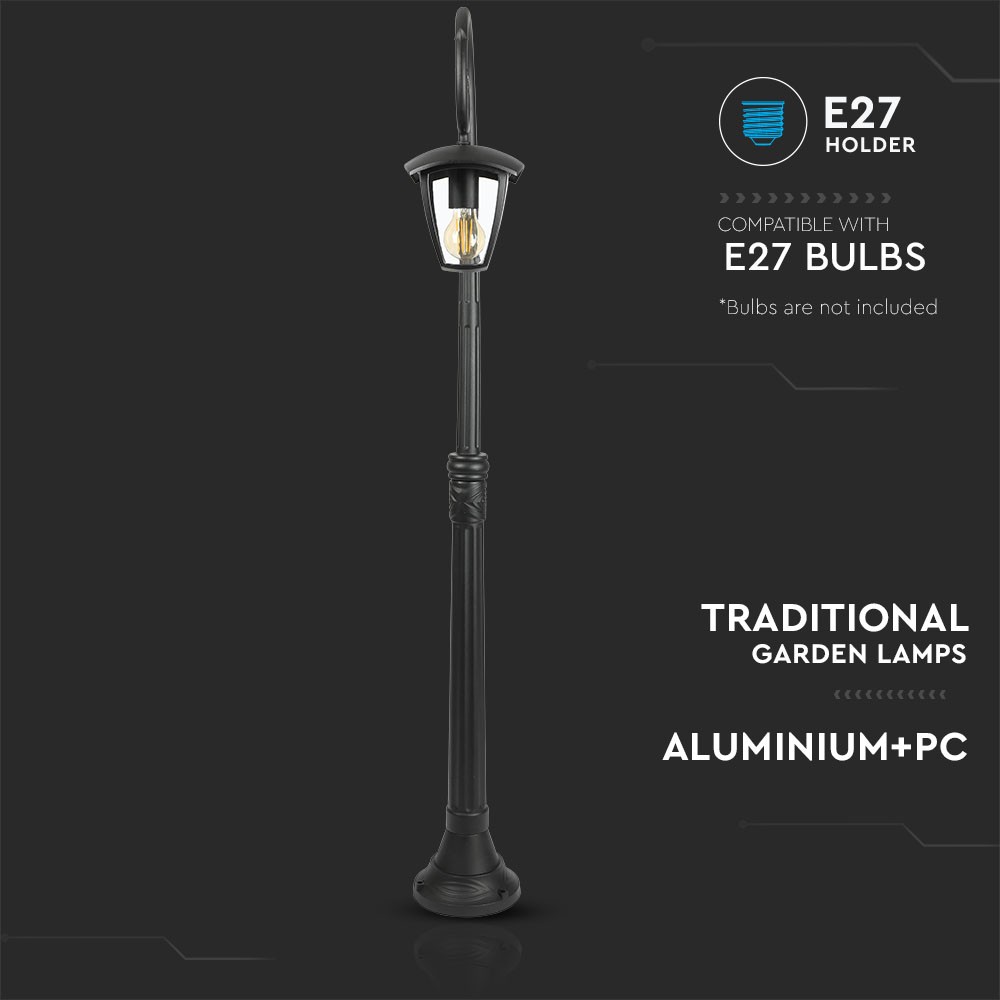 Sort E27 havelampe på stander med IP44-klassifikation. Fremstillet af aluminium og PC. Højde: 136,5 cm. Lyskilde medfølger ikke.