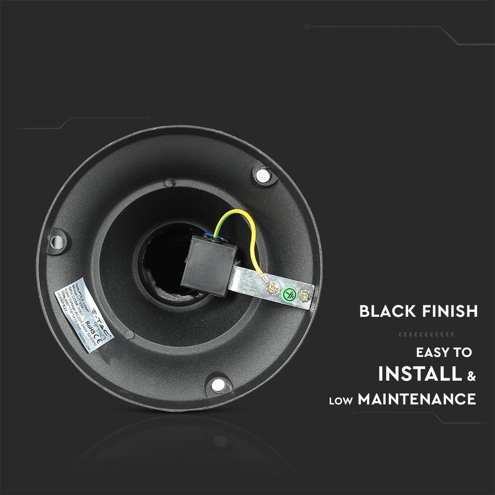 Lampen er konstrueret i slidstærkt aluminium og har en sort finish, der komplementerer de fleste udendørs omgivelser. Den er IP44-klassificeret, hvilket betyder, at den er beskyttet mod vandsprøjt og støv, og dermed velegnet til udendørs brug.