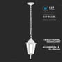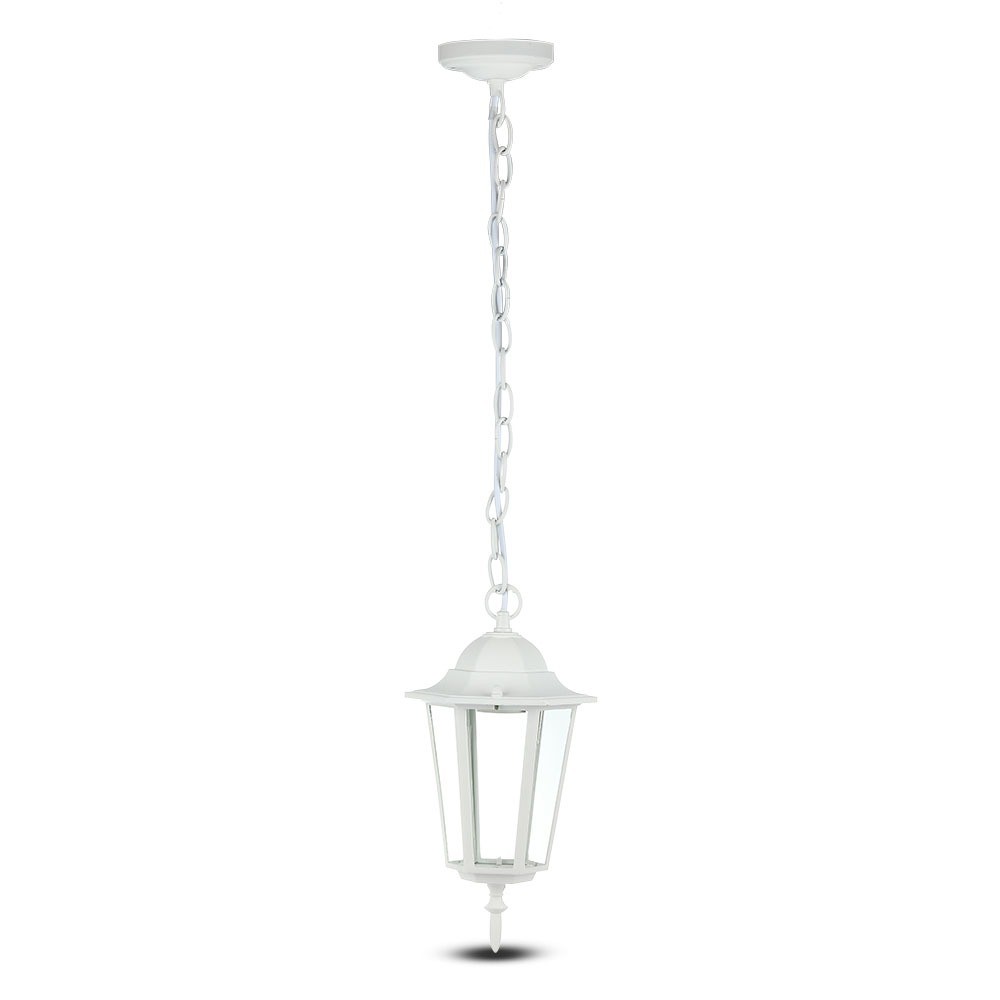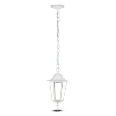 Stilfuld E27 havelampe i retro design, hvid. IP44-klassificeret, lavet af aluminium og glas. Leveres uden lyskilde.