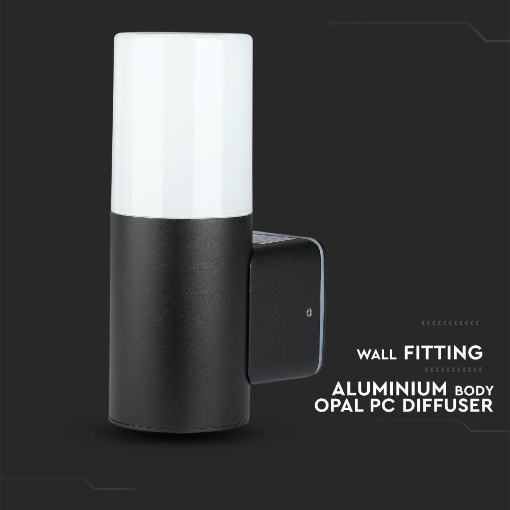 Elegant havevægslampe i sort aluminium med opal PC diffuser. GU10 fatning, IP54-klassificeret. Perfekt til udendørs brug.