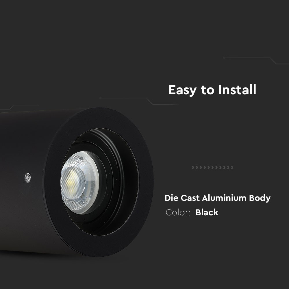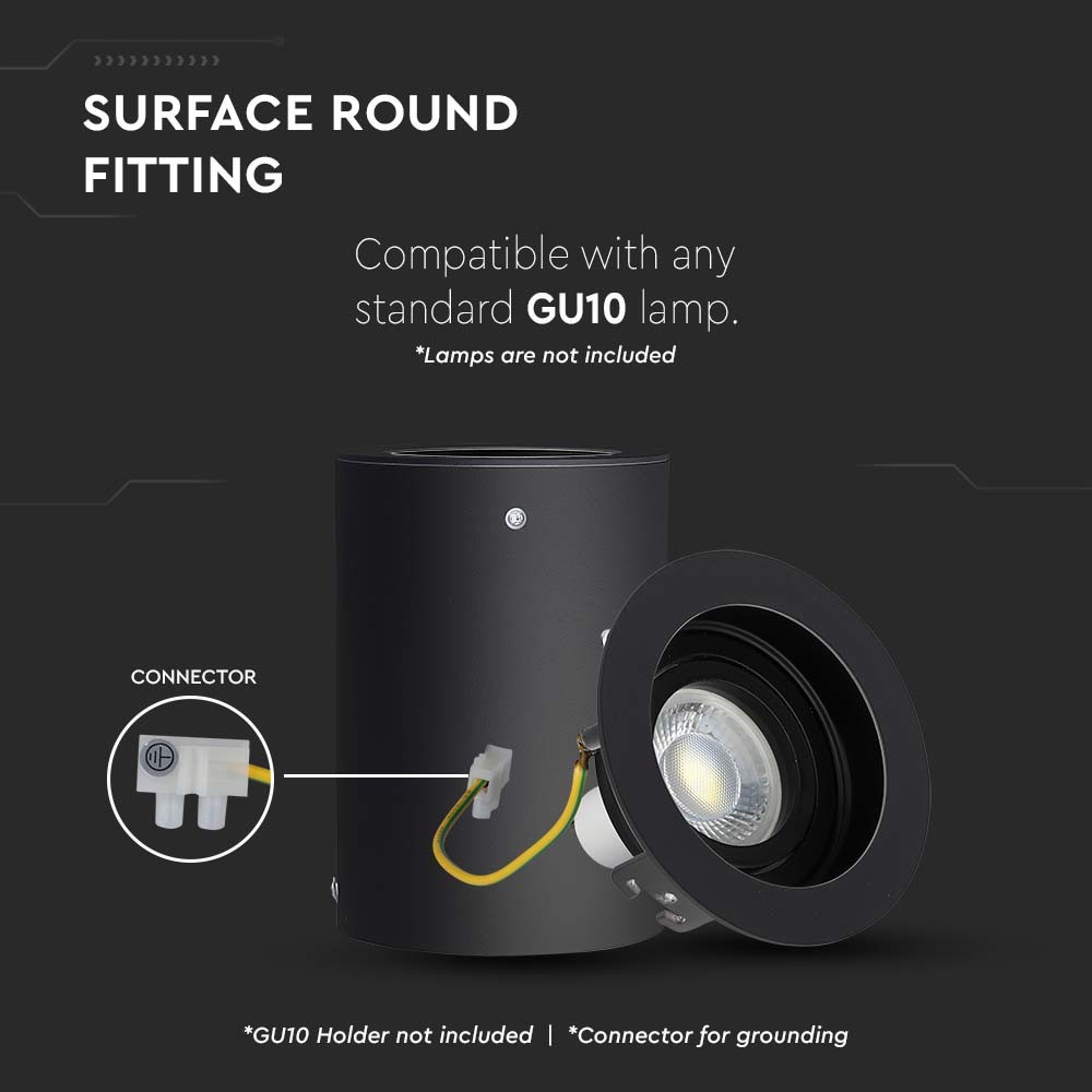 Rund GU10 fatning i sort die-cast aluminium. Ideel til indendørs belysning med IP20 klassifikation.