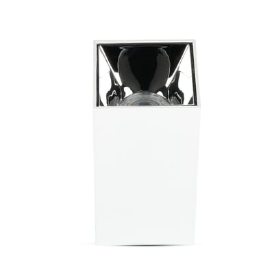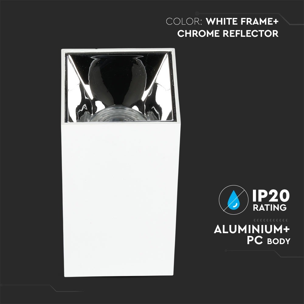Firkantet GU10 påbygningsspot i hvid/krom. IP20-klassificeret til indendørs brug. Lyskilde medfølger ikke.