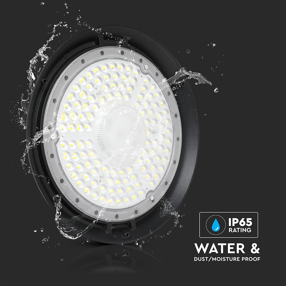 Highbay'en er konstrueret med et robust aluminiumshus, der sikrer holdbarhed og effektiv varmeafledning. Med en IP65-klassifikation er den beskyttet mod støv og vandstråler, hvilket gør den velegnet til brug i industrielle omgivelser, lagre, værksteder og andre steder, hvor der stilles høje krav til belysningen.
