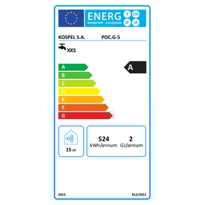 Beholderen er udstyret med rørføring nedad, hvilket forenkler installationen i mange opsætninger. Den er klassificeret med energiklasse A på en skala fra A+ til F, hvilket indikerer en energieffektiv drift.