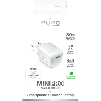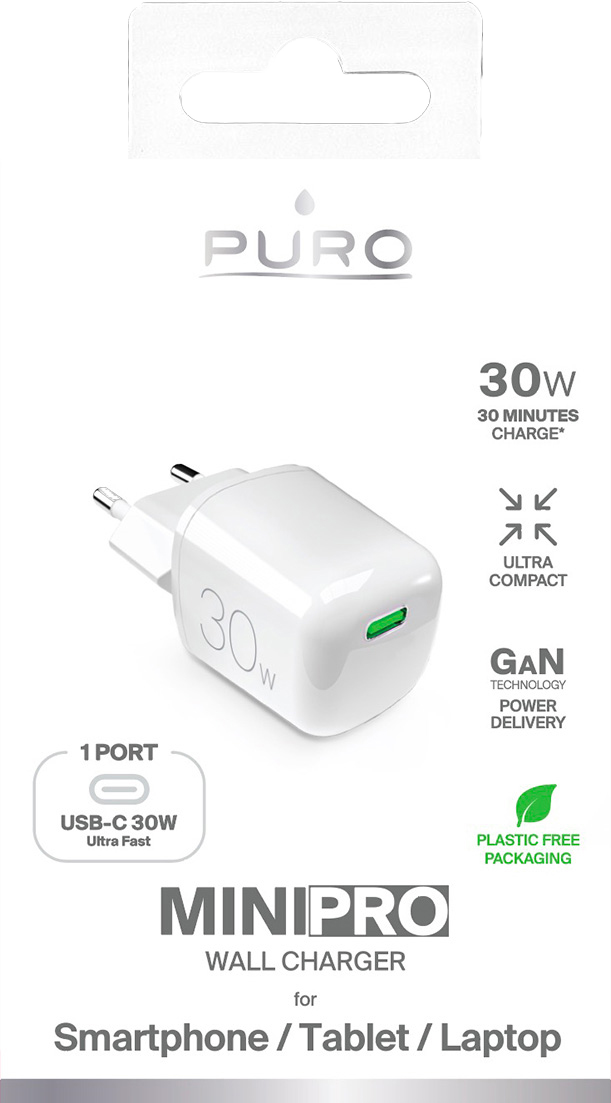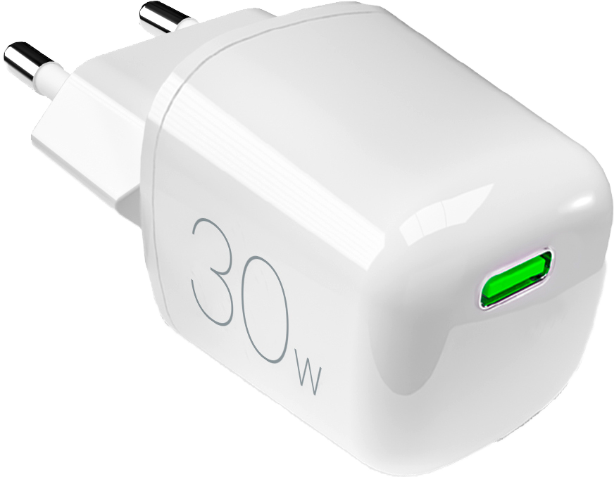 Ultra-kompakt vægoplader med GaN-teknologi, der hurtigt oplader din smartphone på 30 minutter, tablet på 60 minutter og laptop på 90 minutter.