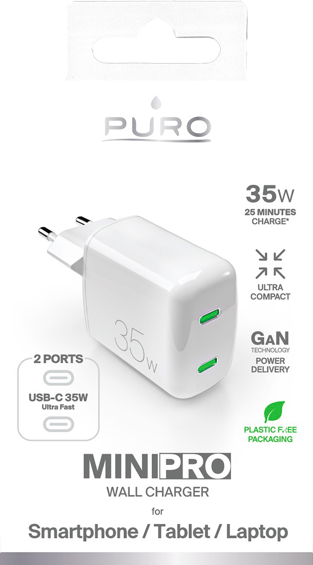 Denne ultra-kompakte GaN vægoplader med 35W og 2xUSB-C porte oplader din smartphone på 25 minutter, din tablet på 50 minutter og din laptop på 78 minutter.