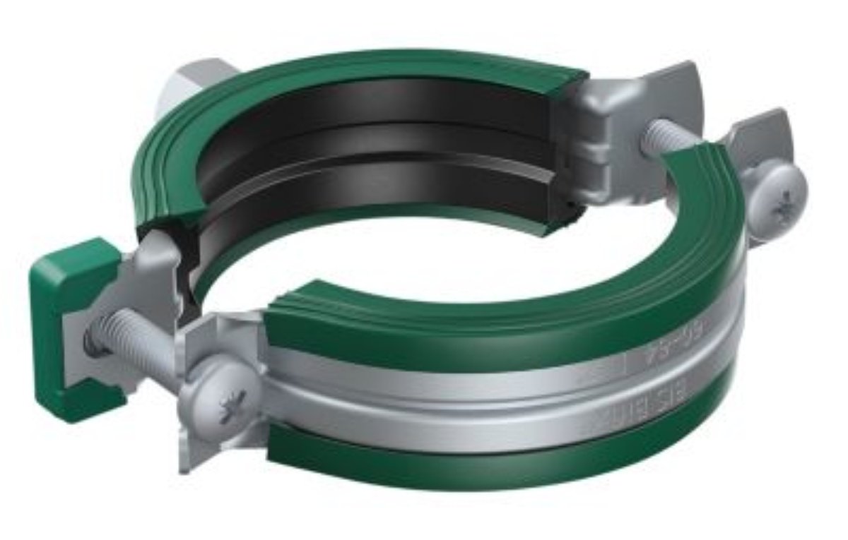 Det 2-delte EPDM gummi giver en nem positionering af røret under installationen, og når rørbøjlen er lukket, hviler røret på en blød, sort gummiring, hvilket bidrager til en effektiv støjreduktion.