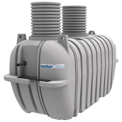 Effektiv Watercare bundfældningstank 10PE, 4 m³ med integreret pumpebrønd (Grundfos AP35B5006A1). Inkl. opføringsrør og komplet rørføring.