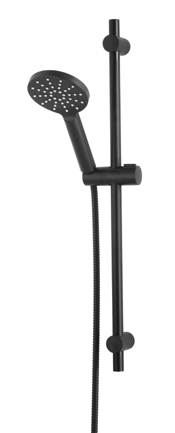 Wave 50 brusestangsæt i mat sort med rund håndbruser. Vandbesparende funktion og 3 stråletyper.
