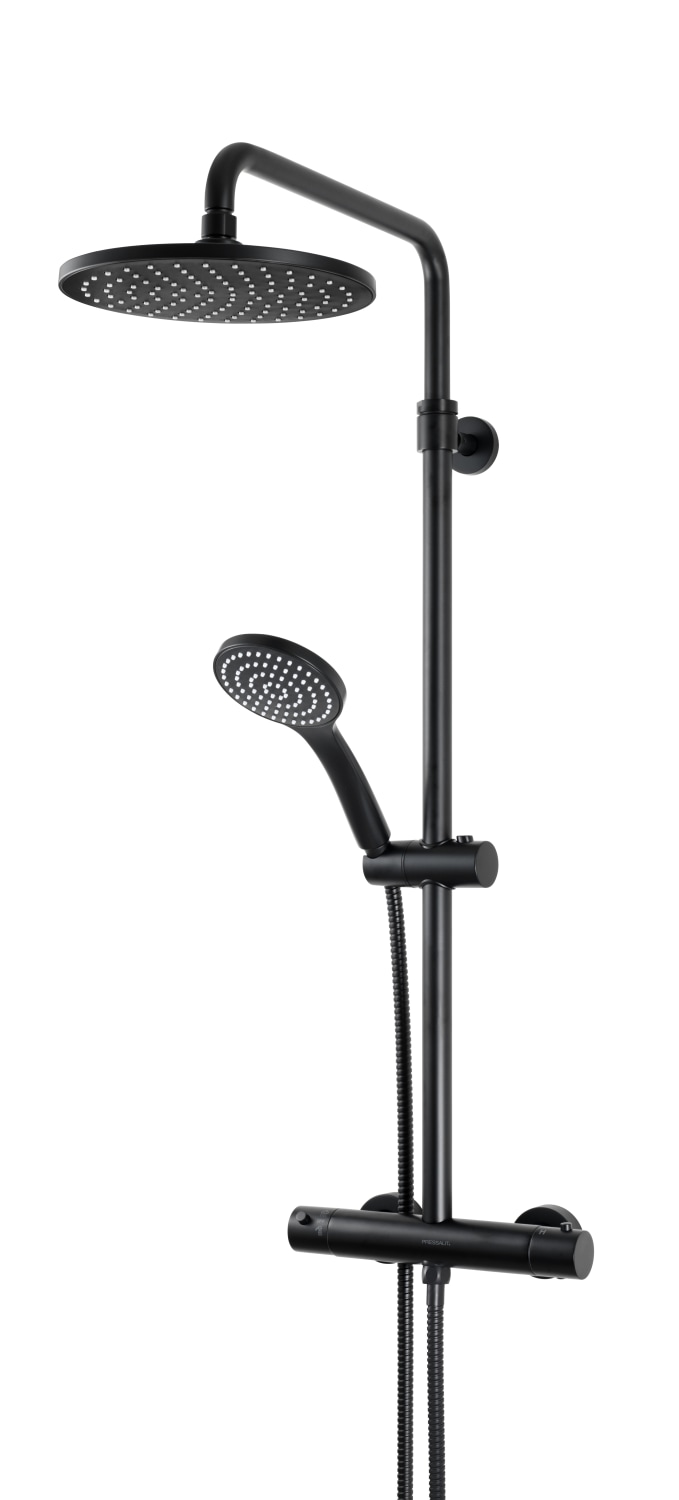 Komplet brusesystem med termostat, 2-grebs betjening og mat sort finish. Inkluderer både loft- og håndbruser.