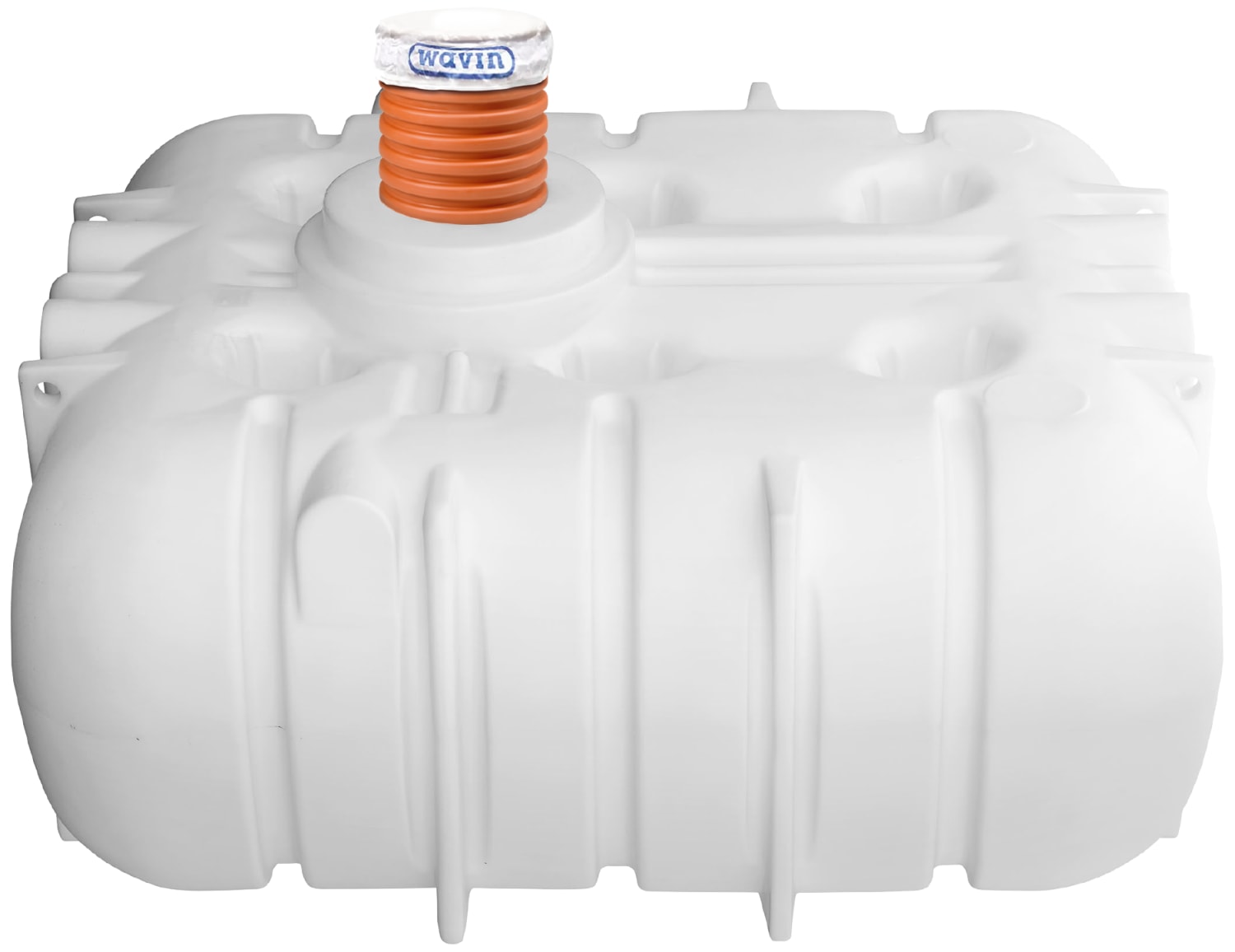Stor samletank på 5000 liter i PE fra Wavin, komplet med opføringsrør. Ideel til opsamling af væsker.