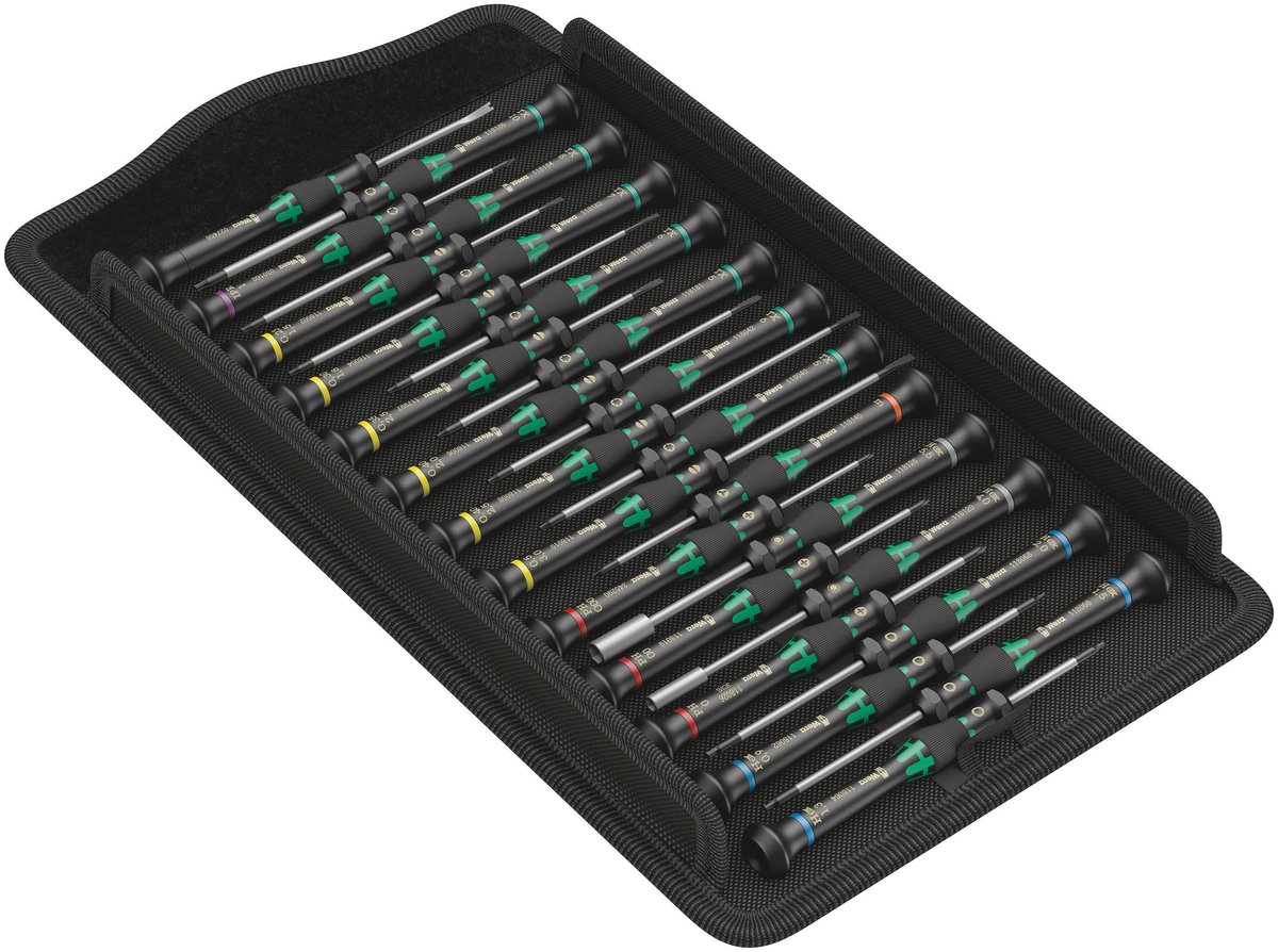 Wera Micro skruetrækkersæt til finmekaniske opgaver. Lyn-drejezonen understøtter hurtig rotation. Farvemærkning efter profil og størrelse. Leveres i robust taske.