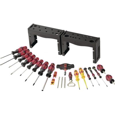 - Opbevaringsracks: To medfølgende racks (sammensættes af 9545, 9547 og 9546) sikrer ordentlig og pladsbesparende opbevaring på arbejdsbordet eller væggen.