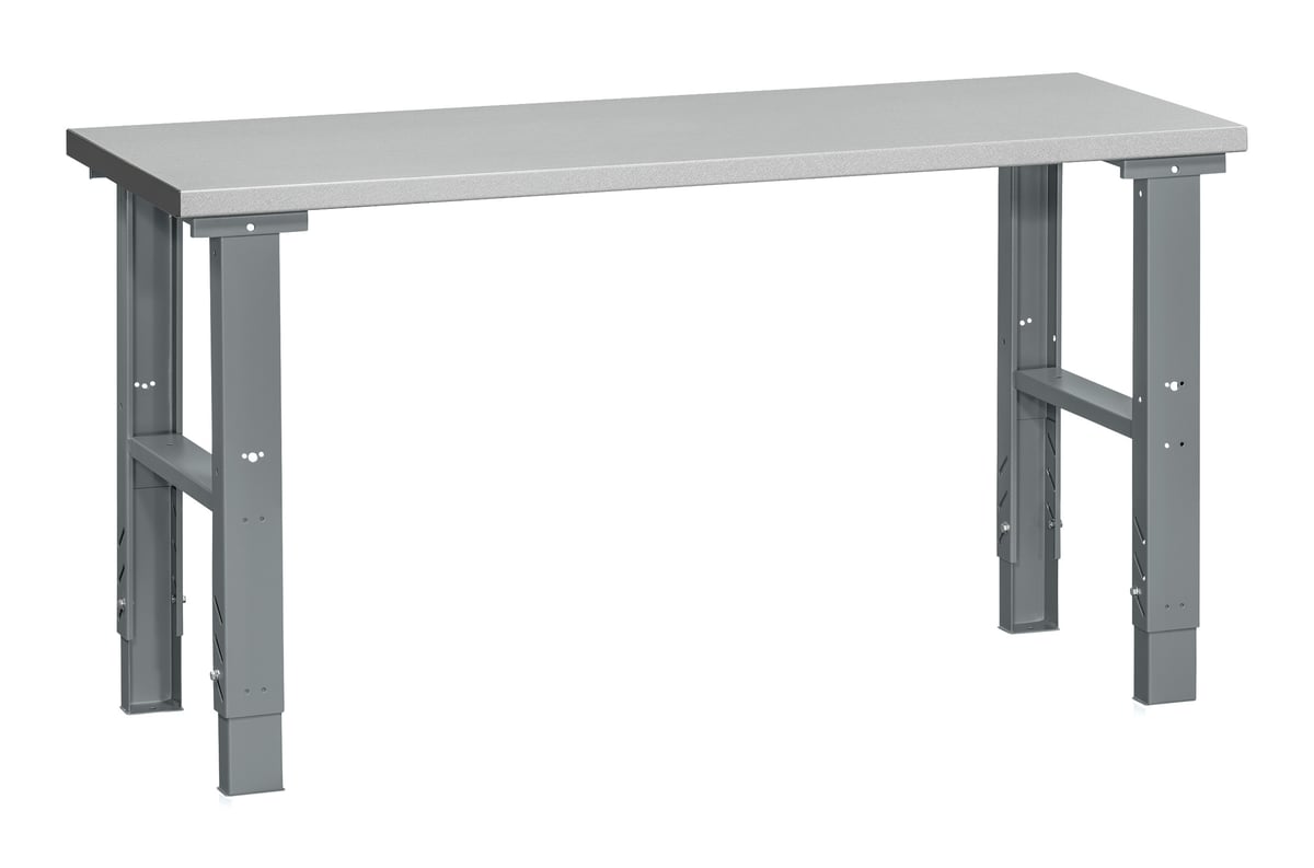 Komplet filebænk med justerbare stålbukke og en robust stålbordplade (1600x600x40 mm). Maksimal belastning: 500 kg (fordelt vægt).
